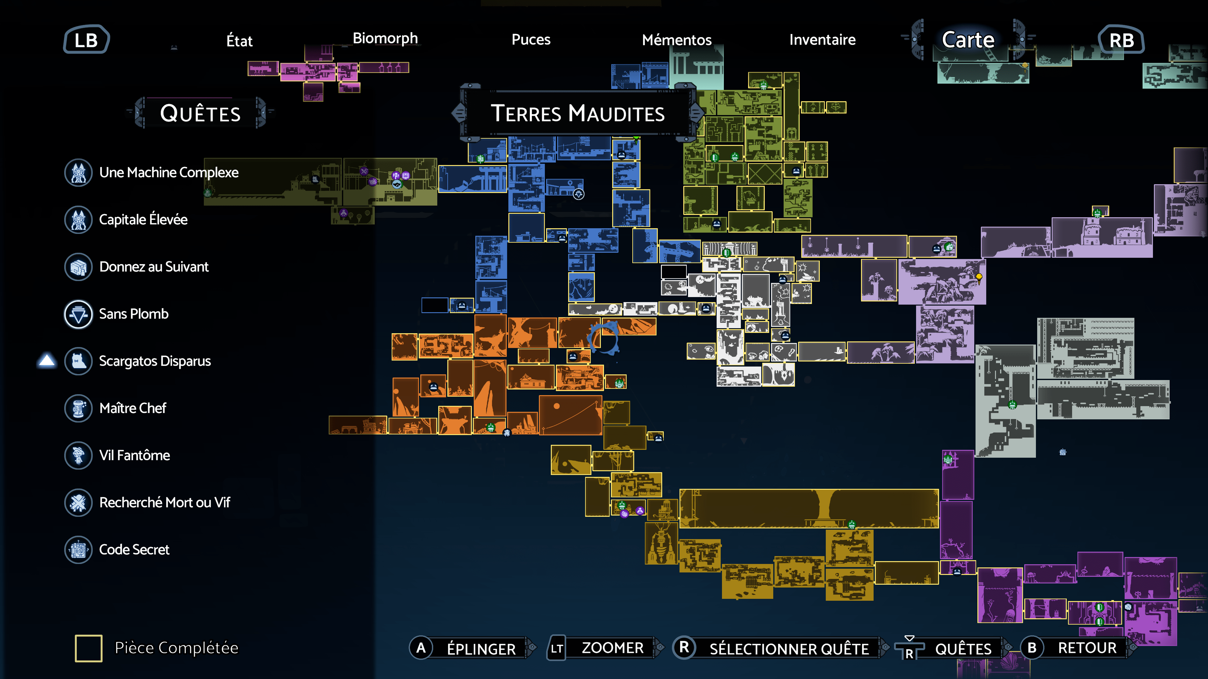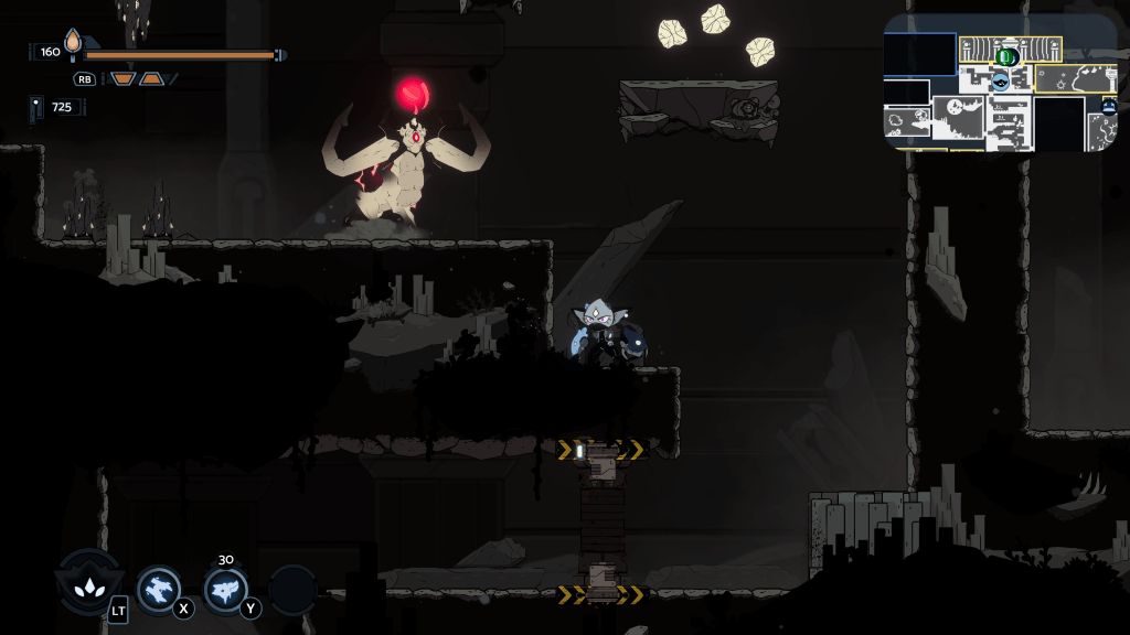 Comme dans tout bon Metroidvania qui se respecte, Biomorph demande au joueur de trouver des capacités afin de pouvoir progresser. Comme le saut mural ou la nage par exemple. Il possède aussi une carte qui se dévoile au fur et à mesure de votre progression. Le studio a d’ailleurs eu plusieurs bonnes idées avec cette dernière. Tout d’abord vous pouvez placer des marqueurs de différentes couleurs afin de marquer des objectifs. Ensuite, le joueur va parfois trouver des scanners qui permettent d’indiquer l’intégralité des salles dans la zone en cours. Ces salles resteront noires tant que vous ne les aurez pas explorées. Enfin, les salles entièrement complétées seront entourées d’une bordure jaune, évitant des allers-retours inutiles au joueur.