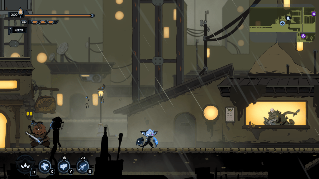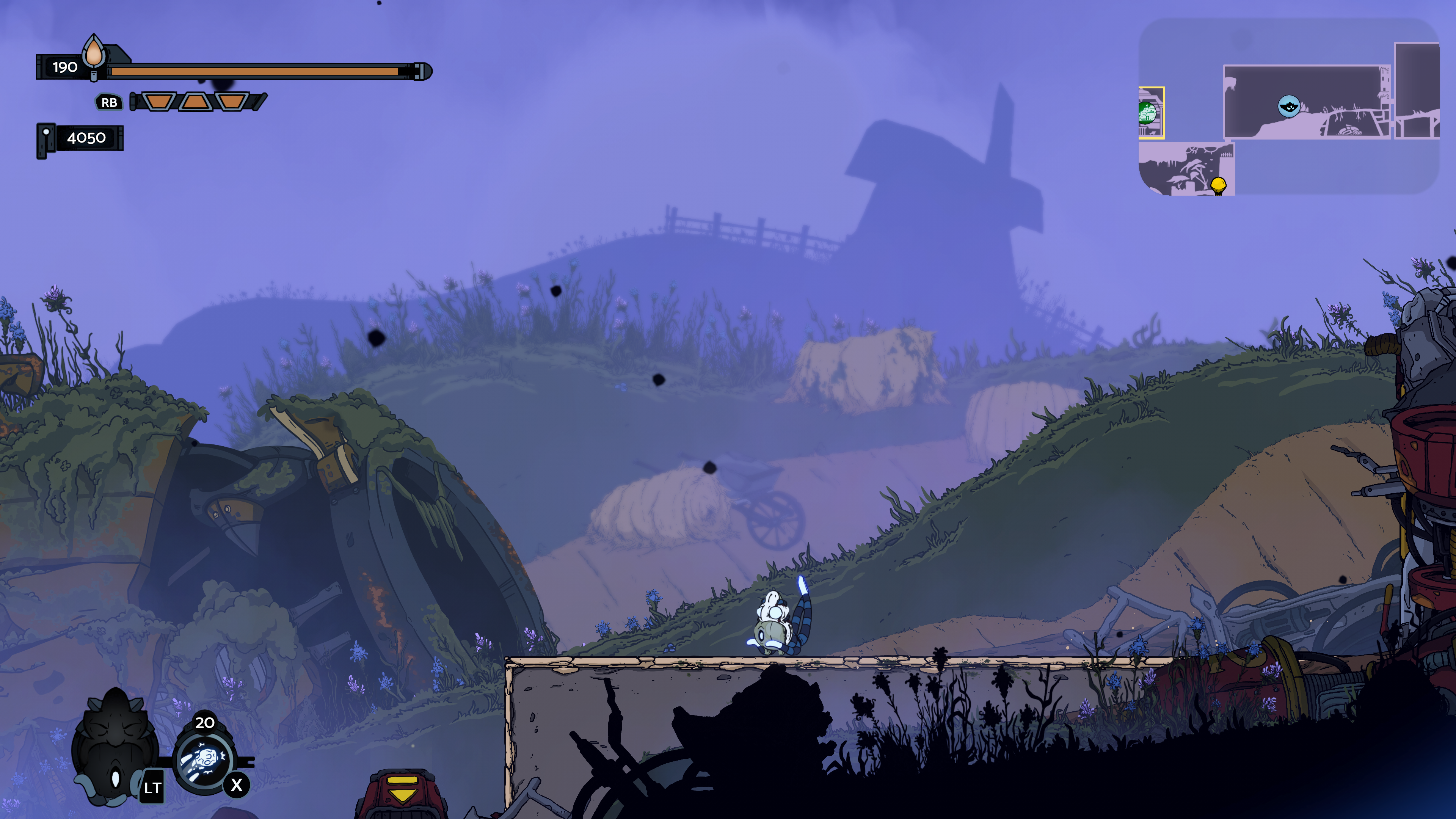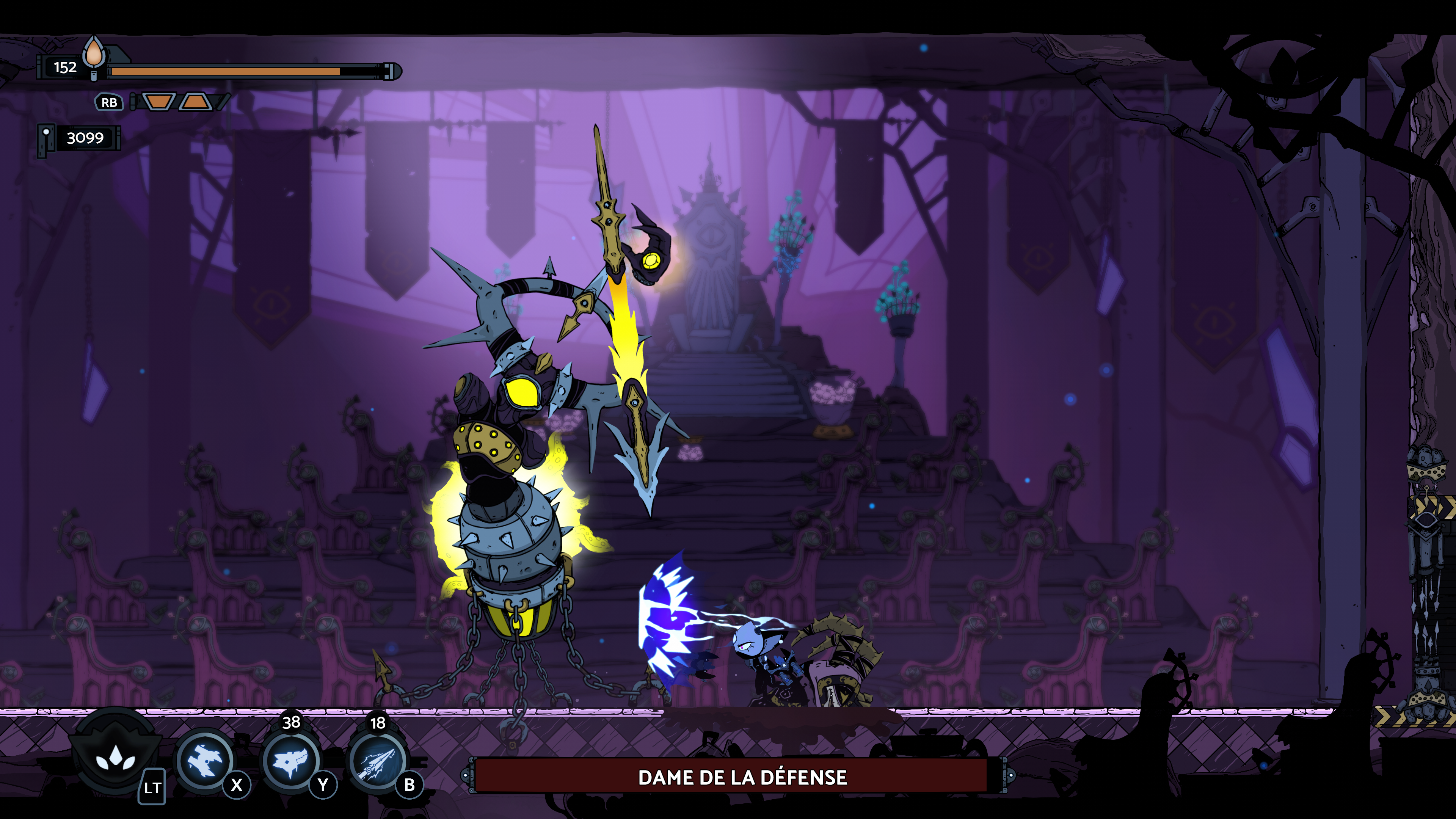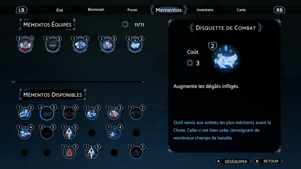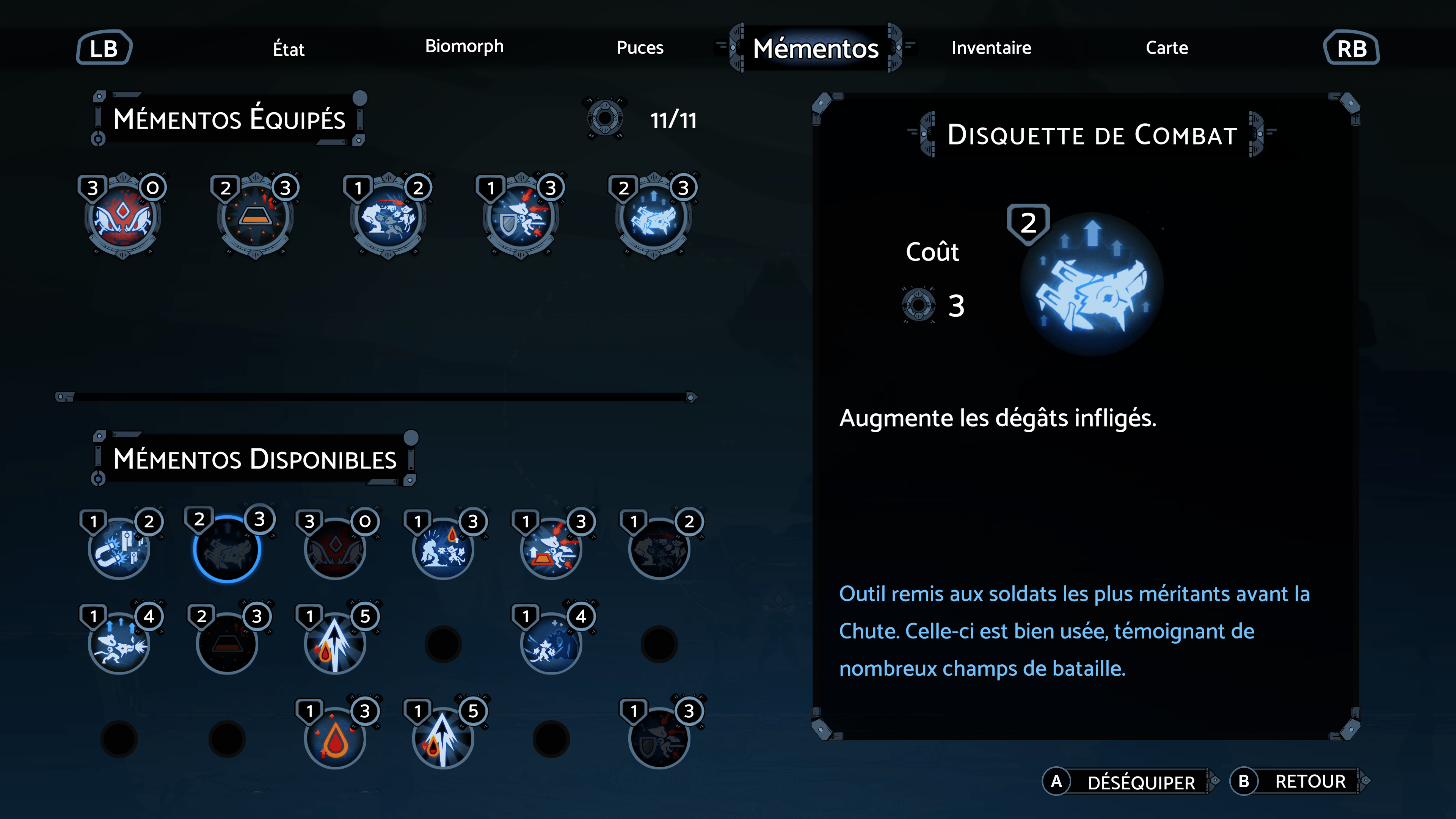 Les stations S.A.F.E servent aussi à changer vos puces, vos mémentos et vos métamorphoses. Quésako me direz-vous ? Eh bien c’est tout simple. Vos puces sont en fait vos attaques, réparties sur 3 boutons de votre manette (X,Y,B) et sont au nombre de 15 en tout. Vous pourrez les améliorer en trouvant des pièces et avec un peu d’argent auprès de marchands en ville. Les mémentos eux sont un peu comme les badges dans Hollow Knight. Ce sont des compétences passives qui permettent par exemple d’infliger plus de dégâts aux petits ennemis, d’augmenter votre barre de vie, ou encore d’infliger plus de dégâts aux boss uniquement. Il y en a 18 en tout et chacun de ces mémentos vous coutera 1 à 4 emplacements dans votre inventaire. En sachant qu’on augmente le nombre d’emplacements en progressant.