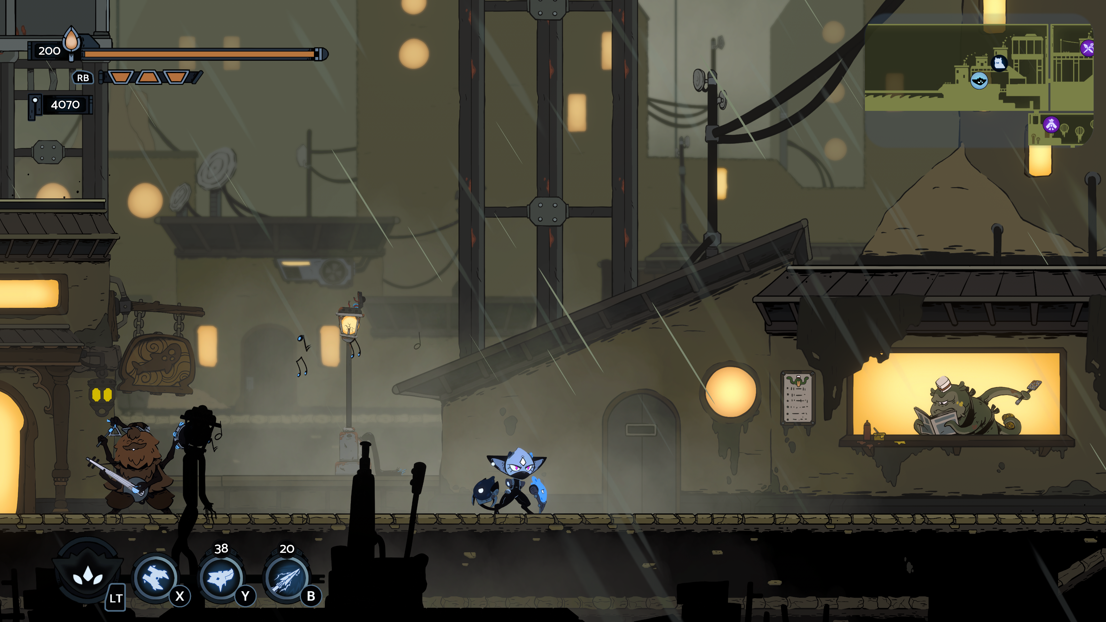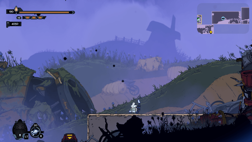 Dès les premiers instants du jeu, le joueur se retrouve dans une situation explosive au côté de Harlo. Une créature assez étrange qui a pour compagnon Zeki et Eny, créatures vivantes qui sont en fait… les bras de Harlo ! Quoi qu’il en soit l’aventure commence dans un laboratoire et vous ne savez pas pourquoi vous êtes ici. Fruit d’une expérience ? On ne peut faire que des suppositions. Parvenant à s’échapper du laboratoire en alerte, Harlo parvient à rejoindre la petite ville de Blightmoor. Et maintenant, il est temps de faire la lumière sur votre passé et votre personnalité, tout en aidant autant que possible les habitants de la bourgade. Avec ses textes entièrement en français, l’histoire de Biomorph est de suite intéressante, compréhensible, et teintée de mystères. Certains personnages sont de plus attachants (comme la mémé avec ses Scargato tout mignons !) et l’univers du jeu, bien que sombre, est vraiment intriguant et plaisant à parcourir. La bande-son composée par William Gough est de plus franchement réussie, avec des musiques tantôt dynamiques et prenantes (les combats de boss notamment) tantôt douces et immersives avec de très jolis morceaux qui restent en tête comme celui de la ville de Blightmoor. Nos yeux ne sont pas non plus oubliés puisque les graphismes du jeu (en 2D) sont vraiment superbes, avec de chouettes animations en arrière-plans parfois. En bref dès le départ, Biomorph marque beaucoup de points et parvient à se créer une identité.