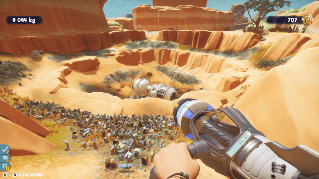 Vous pouvez également compter sur un petit robot qui vous indiquera la présence de déchets, ainsi que sur un module qui émet des bips lorsque vous êtes proche d’un détritus. Pratique, même si certaines petites ordures sont tout de même difficiles à repérer, comme celles dans des buissons par exemple. Ainsi, on passe parfois quelques minutes à chercher une simple canette, malgré le bipeur qui nous indique sa proximité. Frustrant ? Pas forcément car on ressent une forme de satisfaction à nettoyer de fond en comble les cartes. Cependant, seul, le jeu finit par devenir redondant voir ennuyeux, surtout quand vous avez 10000 kilos de déchets à ramasser ! Passer plus d’une heure à ramasser les 3 ou 4 même type de détritus finit inévitablement par lasser un peu. À plusieurs, en revanche, on va bien plus vite (logique) et on s’amuse à chercher le moindre passage secret, construction ou module. À noter que l’on peut communiquer via diverses expressions, un peu à la façon d’un Grounded.