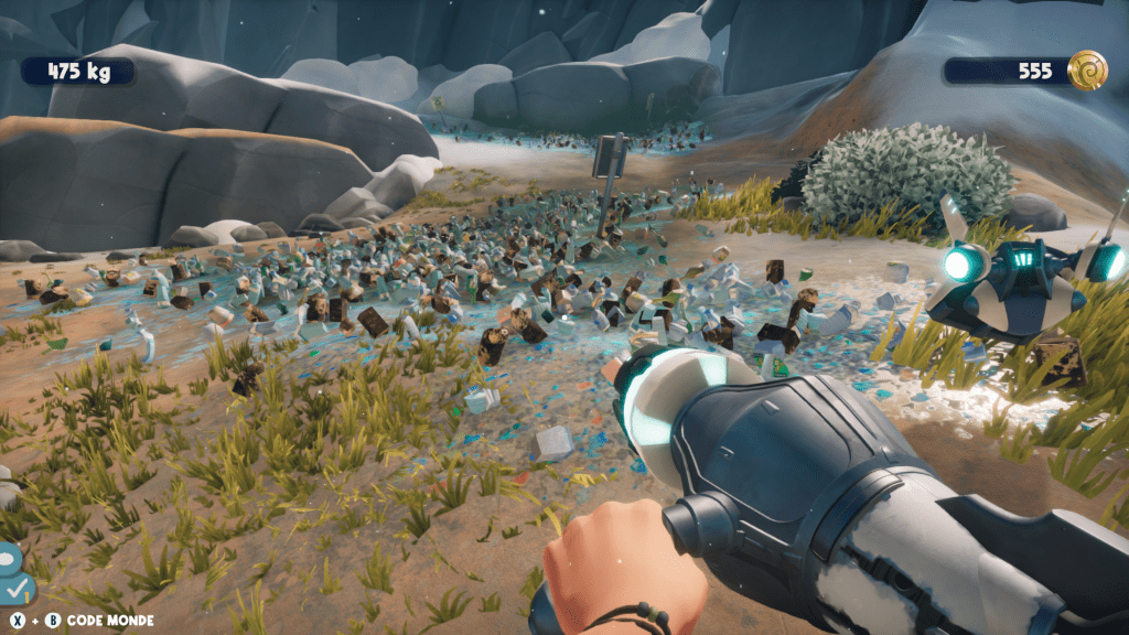 Car si le jeu ne comporte qu’une poignée de cartes (en plus des 4 tutos) il vous faudra tout de même quelques heures pour parvenir à tout nettoyer. Car si les premières cartes peuvent se compléter en quelques minutes, les dernières vous demanderont une à deux heures pour en voit le bout ! Et malheureusement, il est impossible de sauvegarder pour reprendre sa partie plus tard. Heureusement sur Xbox, nous avons le Quick Resume qui permet de palier à cette contrainte. Mais le souci, c’est que le jeu a quelques problèmes techniques, et que nous avons été renvoyés à deux reprises à l’interface… après plus d’une heure de collecte de déchets ! De quoi être frustré donc. Surtout que le jeu accuse aussi de grosses chutes de FPS, allant même jusqu’à freezer de manière assez régulière (en gros l’écran se fige et vous ne pouvez plus rien faire durant une ou deux secondes). On espère donc que ces problèmes seront rapidement corrigés car ils sont à l’heure actuelle assez handicapants. Et c’est bien dommage car à côté de ça, le jeu est capable d’afficher des milliers de déchets et (parfois de très gros) ainsi que plusieurs joueurs en même temps sur une map. Vous pouvez ainsi jouer jusqu’à 8 joueurs (amis proches) ou même jusqu’à 25 joueurs (avec des inconnus) sur de grandes zones partagées lors d’événements. Cela donne ainsi l’impression d’agir ensemble pour la planète, un peu comme lorsque des collectes de déchets citoyennes sont organisées. De plus, lors des grandes sessions en ligne, la progression collective donnera lieu à de véritables micro-dons en faveur d’initiatives environnementales actives sur le terrain. Pas besoin de sortir le portefeuille, c’est gratuit, il suffit de jouer ! D’ailleurs le jeu indique avoir déjà récolté 400 euros de dons sur le menu principal. La classe non ?