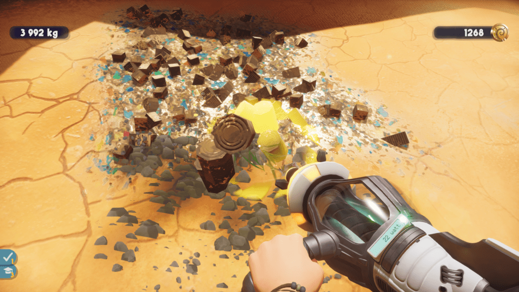 Pour mener à bien votre mission, vous utilisez donc un engin capable d’aspirer des déchets à l’infini. Mais certains détritus sont parfois trop lourds, trop profondément enfoncés dans le sol ou même… radioactifs ! Il faut donc trouver des artefacts pour votre Terra Cleaner, qui vous permettent de passer d’un module à l’autre histoire de s’adapter aux différentes situations. Pour cela, le cheminement est souvent le même. Au début d’un niveau vous aspirez les petits déchets pour dégager un chemin qui vous permet de trouver un module, puis vous utilisez ce module pour aspirer d’autres types de déchets et ainsi de suite. Grâce à l’argent récolté lors du recyclage, vous pouvez augmenter la puissance de votre « arme » ainsi que des modules l’accompagnant. Cela sera d’ailleurs parfois indispensable pour aspirer les déchets les plus imposants.