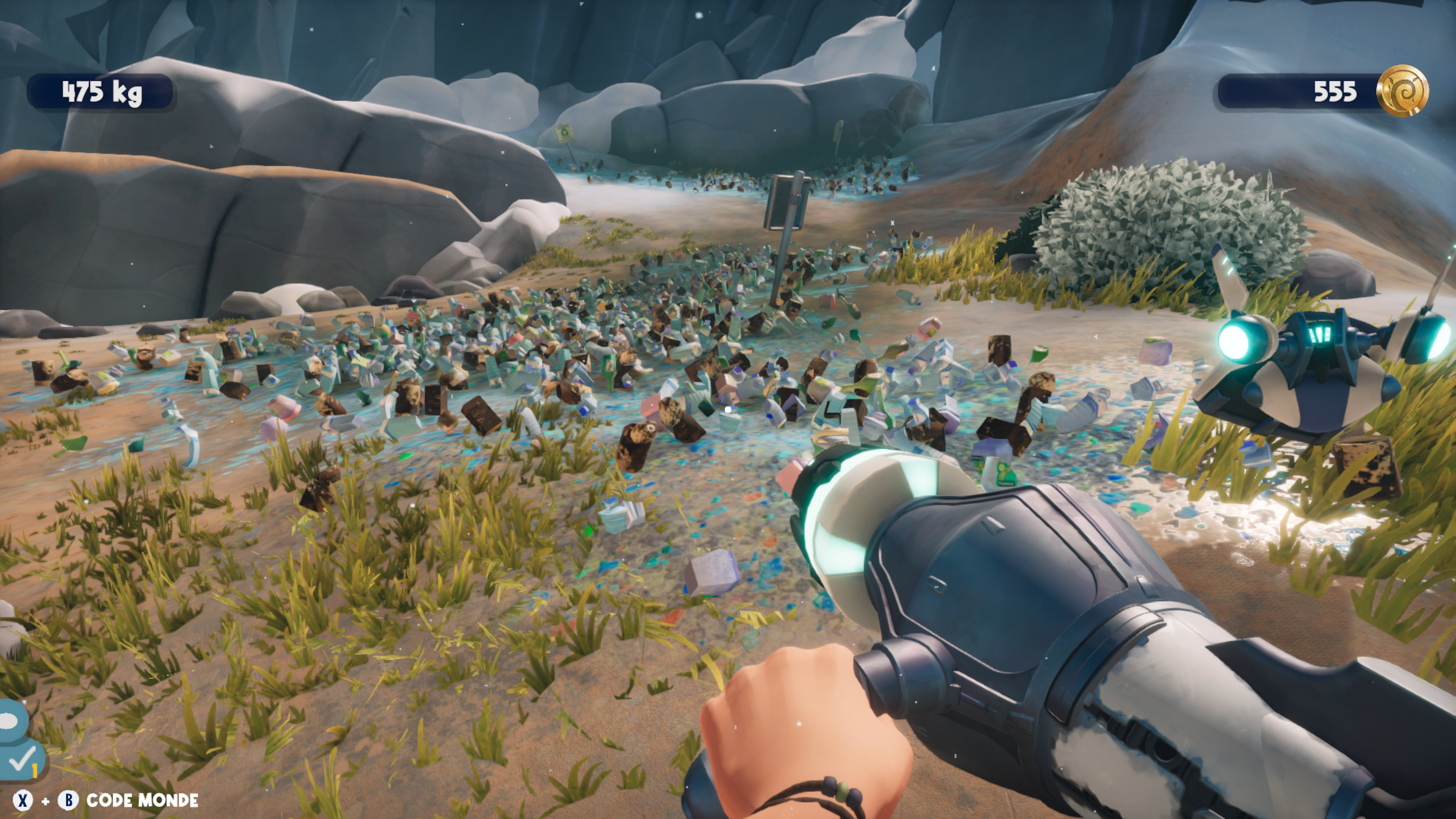 Vous pouvez également compter sur un petit robot qui vous indiquera la présence de déchets, ainsi que sur un module qui émet des bips lorsque vous êtes proche d’un détritus. Pratique, même si certaines petites ordures sont tout de même difficiles à repérer, comme celles dans des buissons par exemple. Ainsi, on passe parfois quelques minutes à chercher une simple canette, malgré le bipeur qui nous indique sa proximité. Frustrant ? Pas forcément car on ressent une forme de satisfaction à nettoyer de fond en comble les cartes. Cependant, seul, le jeu finit par devenir redondant voir ennuyeux, surtout quand vous avez 10000 kilos de déchets à ramasser ! Passer plus d’une heure à ramasser les 3 ou 4 même type de détritus finit inévitablement par lasser un peu. À plusieurs, en revanche, on va bien plus vite (logique) et on s’amuse à chercher le moindre passage secret, construction ou module. À noter que l’on peut communiquer via diverses expressions, un peu à la façon d’un Grounded.