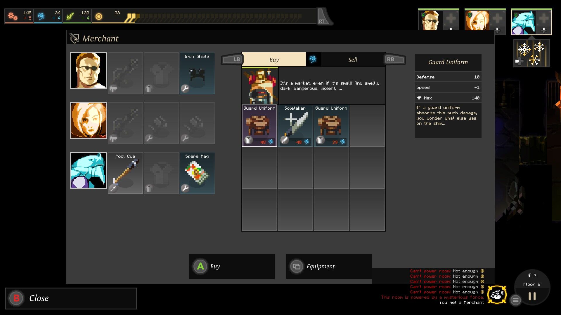 Dans Dungeon of the Endless, vous devez d’abord localiser la sortie pour ensuite y faire acheminer un cristal énergétique en le portant par un de vos personnage mais attention durant cette action, il ne pourra pas attaquer donc choisissez bien de préférence quelqu’un de rapide. L’originalité de ce jeu réside dans sa gestion de ressources (partie importante dans les jeux de la franchise Endless ), vous devrez donc jongler entre 4 types de ressources (Industrie, Science, Nourriture et Brume) . « Industrie » servira à construire des modules comme des tourelles, des générateurs de ressources… « Science » permet de chercher de nouveau module , la « Nourriture » pour faire monter de niveau de vos personnages . En effet, chacun dispose d’un niveau et de caractéristiques propres qu’il s’agit d’améliorer pour survivre face à des ennemis de plus en plus puissants. Il est aussi possible de les équiper avec des objets trouvés dans les coffres ou achetés directement auprès d’un marchand, de plus cette ressource sert aussi à se régénérer et à recruter d’autres compagnons donc très utile.