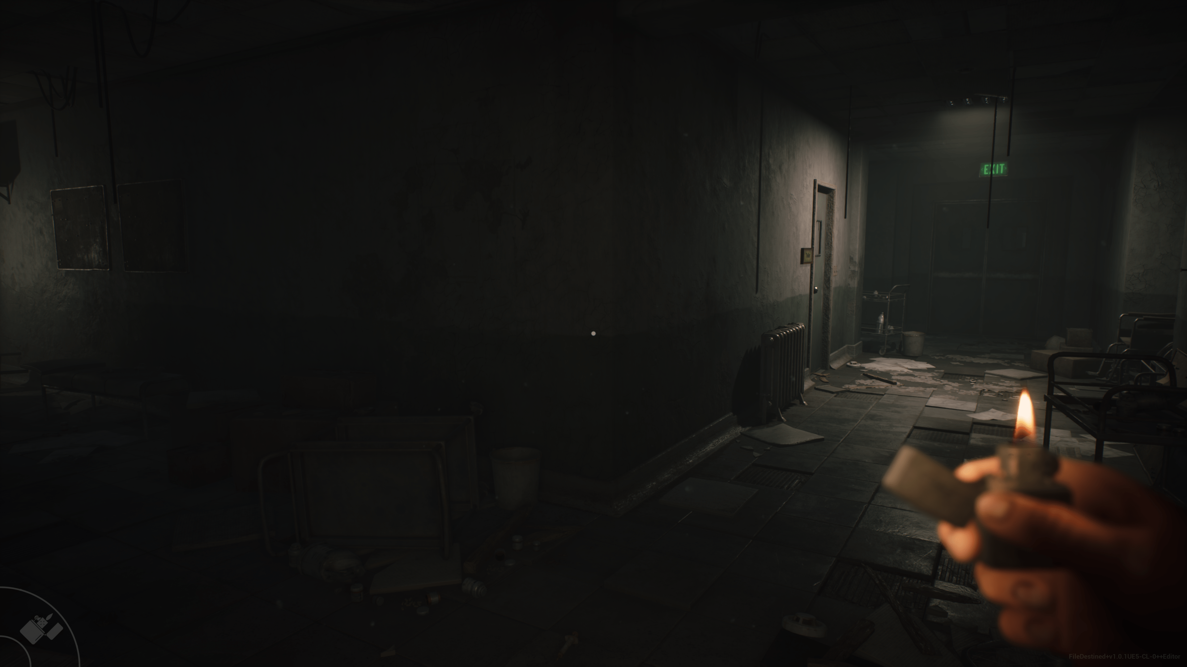 Nous incarnons un certain Oliver, qui atterrit dès le début du jeu dans une pièce, grâce à un casque VR. Une voix féminine lui apprend de suite à interagir avec son environnement. Ramasser des objets, ouvrir des tiroirs, accéder à son inventaire ou encore à ses notes, voilà un tuto parfaitement déguisé. Mais surtout, nous apprenons à nous servir d’un briquet, petit outil indispensable qui permettra de s’éclairer dans les sombres couloirs tout au long du jeu. Car oui File Destined place le joueur dans un univers particulièrement ténébreux et oppressant, où seule la lumière de ce briquet vous permettra de vous diriger et de trouver des indices. Mais il faudra l’utiliser judicieusement, car l’essence se vide assez rapidement, et il va donc falloir trouver des recharges sous peine de finir dans le noir ! À la merci des monstres ? Pas vraiment, puisque le jeu est essentiellement constitué de jumpscares et de salles à fouiller, sans le moindre ennemi capable de vous tuer. Les armes que vous trouverez en explorant ne sont donc que des indices parmi tant d’autres et vous n’aurez jamais à vous en servir. Au final, le jeu est donc un peu un Walking Simulator, où le but est de ramasser des collectibles pour faire la lumière sur cette mystérieuse affaire et déverrouiller les salles suivantes.