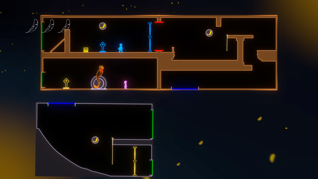 Nous incarnons les jumeaux Abi et Ben. Alors qu’ils étaient tranquillement chez eux dans leurs chambres, les petits héros vont se retrouver transportés dans un autre monde, guidé par un mystérieux Phénix. Séparés, ils vont devoir se rejoindre dans les différents niveaux tout en collectant trois plumes à chaque fois au passage qu’ils vont devoir apporter au Phénix. Le tout sur trois mondes comportant 11 niveaux soit 33 niveaux en tout et donc 99 plumes à récupérer. Hélas l’histoire est un peu mince, sans dialogues ni textes, et on ne nous explique jamais vraiment le pourquoi du comment. On se concentre donc sur le gameplay, qui, il faut bien le dire, va faire travailler un petit peu vos méninges ! En effet pour collecter les plumes et se rejoindre, les enfants vont devoir reconstruire les lieux dans lesquels ils évoluent. Ainsi, si vous êtes bloqués par une porte fermée, vous pouvez avec l’aide de la touche RT accéder aux visuels des salles et en réarranger l’ordre selon plusieurs possibilités. Timing, précision, observation, ou encore énigmes reposant sur la physique, le jeu parvient à nous tenir en haleine et à diversifier ses puzzles du début à la fin. Si on cherche parfois un moment, on finit souvent tout de même par trouver une solution, et il ne faudra pas plus de trois à quatre heures environ pour terminer le jeu. Un peu plus en revanche pour débloquer les succès qui demandent de réaliser des actions spécifiques !