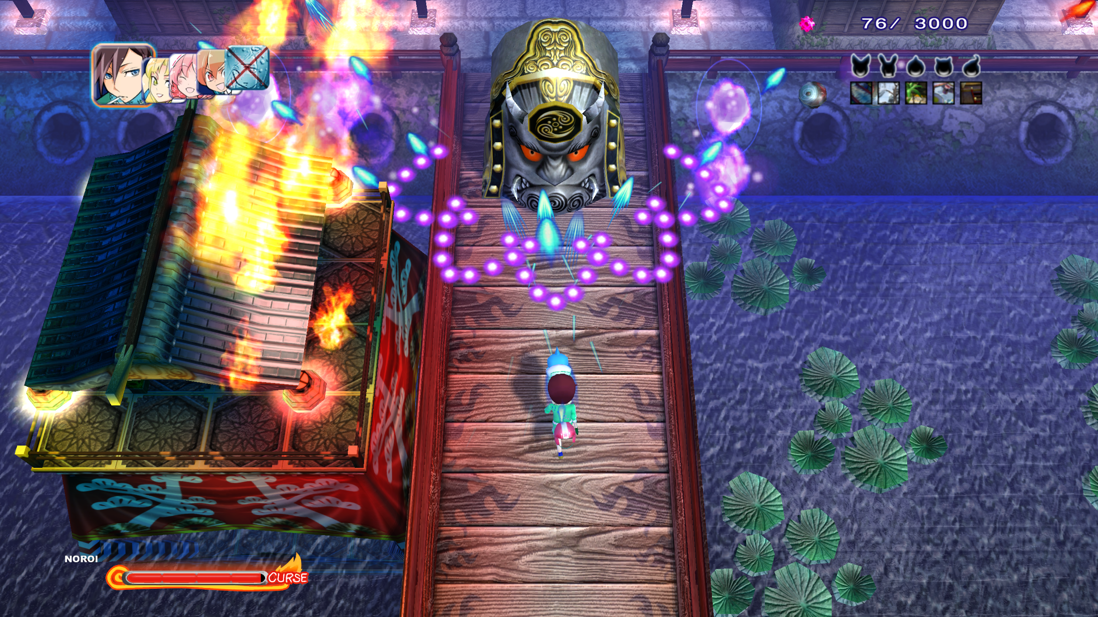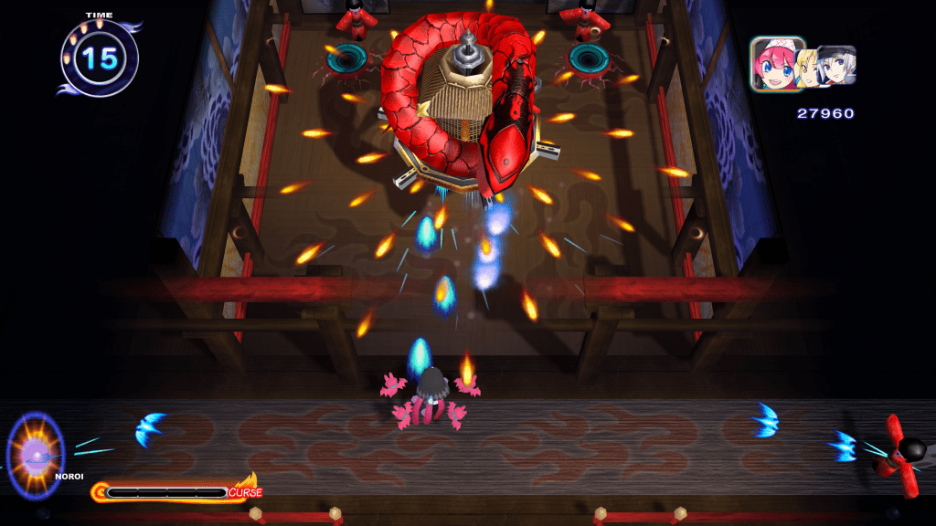 Comme de nombreux shoot’em up, l’histoire n’est pas particulièrement développée dans Mamorukun ReCurse!. Bon, il faut dire que ce n’est de toute manière pas ce que l’on recherche non plus. Sachez simplement qu’après un accident de voiture, des petits héros sont pris sous l’aile de Fululu au moment de leurs morts, et sont chargés de sauver le Netherworld des forces métalliques. Oui, c’est assez obscur ! Quoi qu’il en soit, nous avons le choix entre 7 personnages, possédant différentes manières de tirer ; là aussi, comme dans la plupart des jeux de ce style. On peut en choisir 3 en tout durant nos parties (5 en mode histoire), et si un meurt, alors on prend le contrôle du héros suivant. En cours de route, on peut renforcer notre puissance de feu en collectant les habituels bonus de puissance, et aussi utiliser une « balle maudite » qui fait en quelque sorte office de super bombe pouvant balayer les tirs ennemis à l’écran et aussi infliger des dégâts. Cette attaque permet également de lancer des malédictions sur les monstres, les rendant plus agressifs. Pourquoi faire ? Pour rapporter plus de points et de bonbons, et donc grossir son score tout simplement ! À noter que vous pouvez aussi marcher sur votre propre malédiction, rendant alors vos tirs rouges, ce qui aura pour effet de ralentir vos ennemis. Des mécaniques intéressantes et qui changent un peu de l’ordinaire donc, amenant plusieurs manières de jouer voir un peu de stratégie si vos voulez obtenir un bon score.