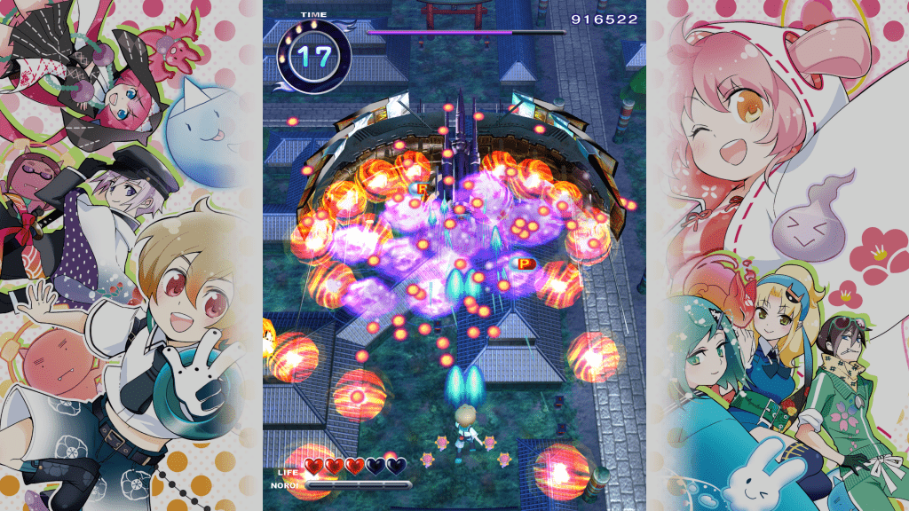 Au rayon des nouveautés, Mamorukun ReCurse! propose désormais un format d’écran plus moderne, à savoir le format écran large. Plus intéressant encore, le joueur a le choix entre deux types de maniabilité. À savoir la version classique où on laisse son doigt enfoncé sur un bouton pour tirer ou une nouvelle version de jouer façon twin sticks shooters où l’on fait feu avec un stick tout en dirigeant le personnage avec l’autre. Sont inclus aussi les personnages autrefois en DLC payants, ainsi que des costumes et un mode Gallery. En bref, on ne se moque pas de nous question contenu. On constate enfin une légère amélioration des graphismes, même si le jeu a évidemment un peu vieilli. L’ensemble n’est pas laid pour autant, et reste tout à fait acceptable pour un shoot’em up étant donné que, là encore, ce n’est pas ce qu’on attend le plus ici. Enfin, la bande-son du jeu est toujours aussi bonne, avec des musiques dynamiques, et même un thème chanté franchement bien sympathique.