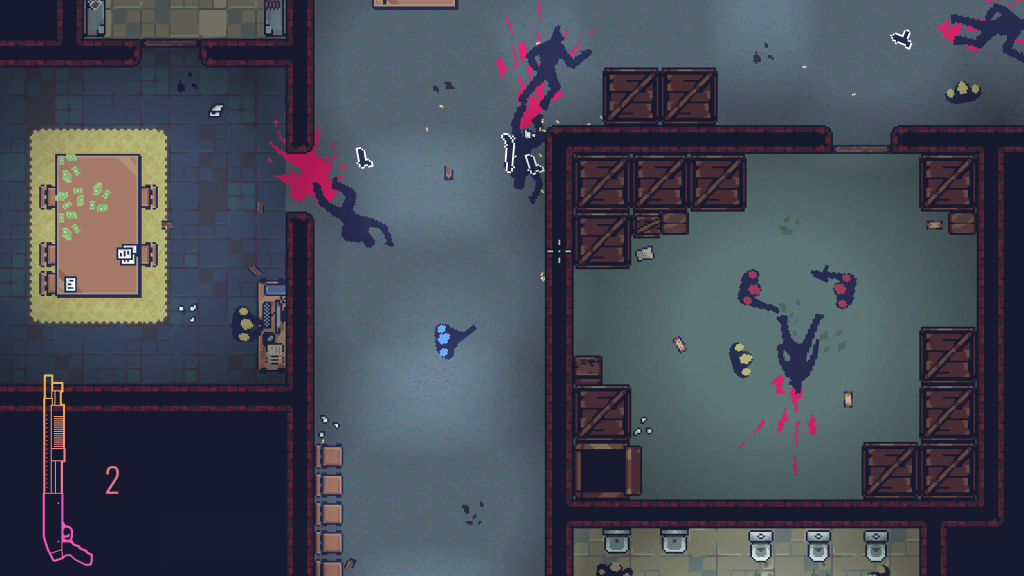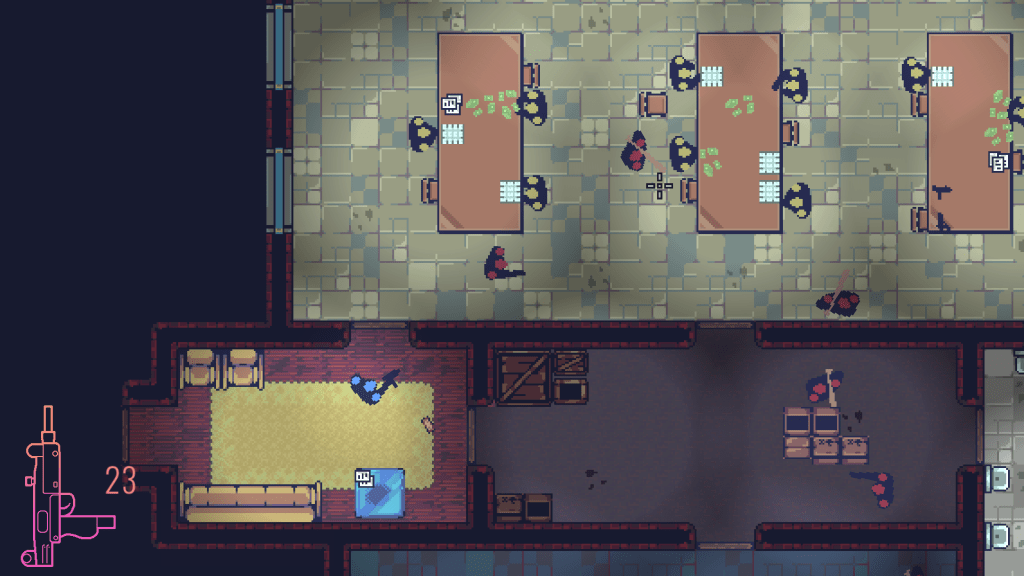 Hélas, ce ne sera pas aussi simple que sur le papier lorsque vous aurez la manette en main. En effet, les criminels sont parfois très nombreux dans les différentes salles, arrivant parfois même dans votre dos si des tirs les ont alertés. En plus des ennemis avec des armes à feu, certains vous foncent dessus avec des battes ou des armes blanches ! À vous donc de jouer avec le temps, d’esquiver les coups et les tirs, et de vous placer correctement. Le jeu est ainsi un peu tactique, car il vous faudra planifier un minimum vos attaques, notamment l’ordre des salles que vous commencerez à nettoyer. Les ennemis ne vous attaquant que s’ils vous voient directement (ou alors tuer l’un des leurs), ou si vous brisez une porte proche d’eux. On avance donc prudemment, ramassant les armes trainant sur le sol lorsque notre arme équipée est vide. Il est également possible de taper au corps à corps si vous n’avez plus de munitions ou si vous voulez tuer plus discrètement. Par la suite vous récupérez également d’autres armes comme des grenades. Avec finalement peu de commandes, le jeu est franchement maniable et se prend rapidement en main.