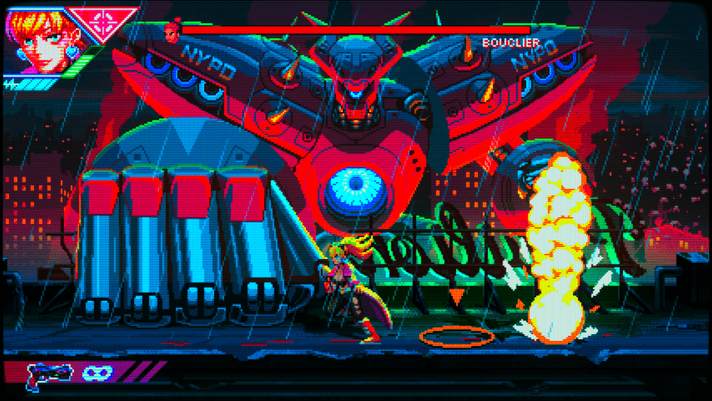 Si tout cela est fait exprès pour rajouter un peu de difficulté, on aurait tout de même aimé un peu plus de rapidité de déplacement surtout pour les roulades. Petit reproche également du côté de la difficulté novice qui sera peut-être déjà trop hard pour qui n’est pas habitué à ce type de jeu. En effet, certains checkpoints sont parfois éloignés (par exemple le niveau dans l’avion où on doit enchainer de nombreux ennemis et boss avant d’avoir une sauvegarde) et il faudra donc apprendre des sections de jeu par cœur et les patterns des boss comme à l’ancienne. Un mot enfin sur la bande-son composée par Gonzalo Varela (et aidé par Qwesta et bien d’autres) évidemment orienté Cyberpunk avec des sonorités mélangeant l’électro et le métal, voir même parfois des morceaux plus doux comme à l’opéra où la musique classique se fait entendre. Un excellent cocktail qui rend les missions encore plus trépidantes !