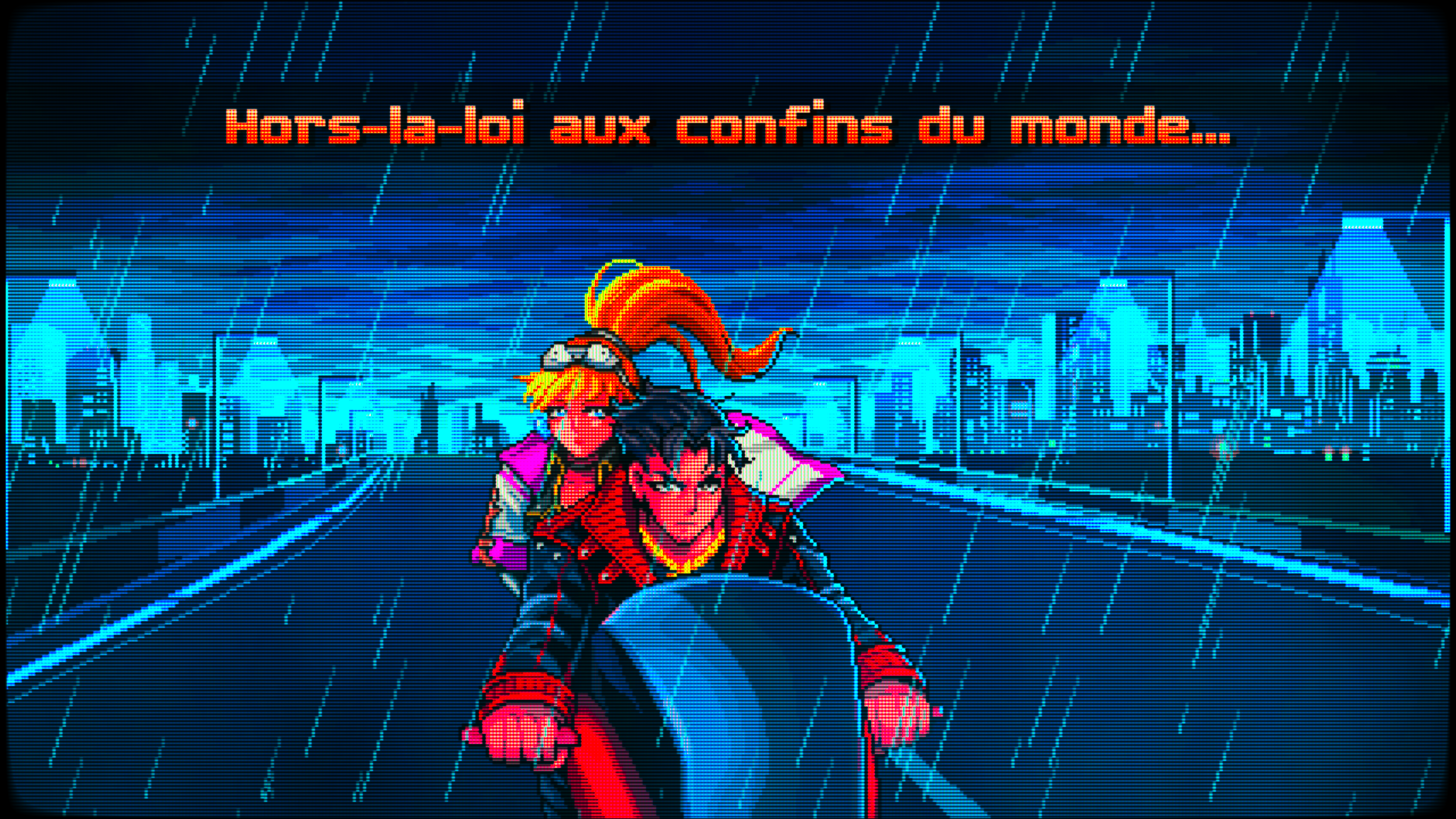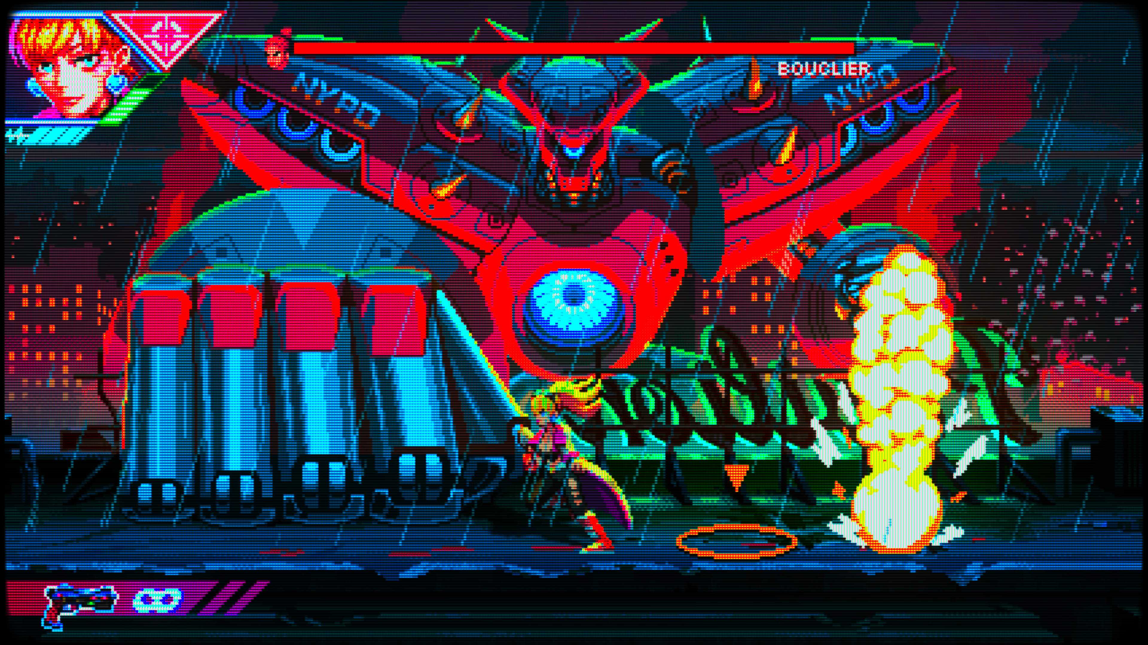 Si tout cela est fait exprès pour rajouter un peu de difficulté, on aurait tout de même aimé un peu plus de rapidité de déplacement surtout pour les roulades. Petit reproche également du côté de la difficulté novice qui sera peut-être déjà trop hard pour qui n’est pas habitué à ce type de jeu. En effet, certains checkpoints sont parfois éloignés (par exemple le niveau dans l’avion où on doit enchainer de nombreux ennemis et boss avant d’avoir une sauvegarde) et il faudra donc apprendre des sections de jeu par cœur et les patterns des boss comme à l’ancienne. Un mot enfin sur la bande-son composée par Gonzalo Varela (et aidé par Qwesta et bien d’autres) évidemment orienté Cyberpunk avec des sonorités mélangeant l’électro et le métal, voir même parfois des morceaux plus doux comme à l’opéra où la musique classique se fait entendre. Un excellent cocktail qui rend les missions encore plus trépidantes !