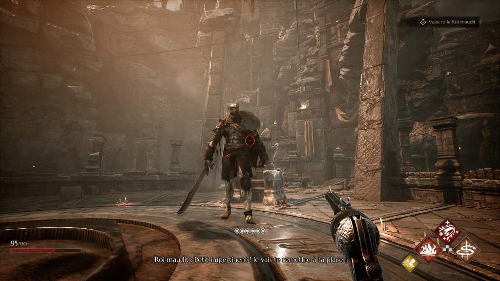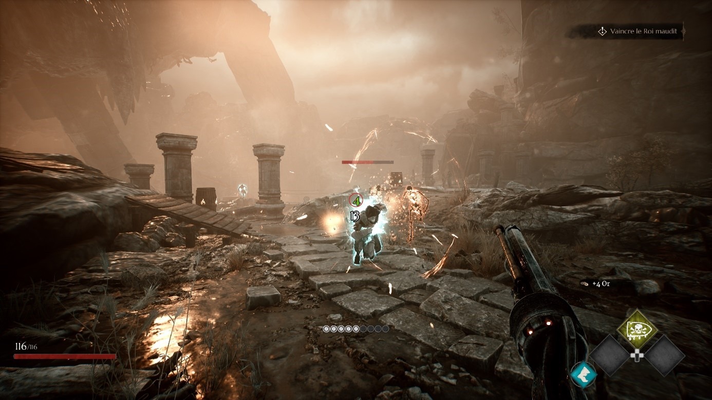 En bref, le jeu est plutôt une bonne surprise côté histoire et narration, même si on aurait apprécié un peu plus de développement pour certains personnages, comme Lady Valérie, une autre émissaire assez intrigante. Hélas, à la manière d’un From Software, très peu de réponses sont données sur certaines parties de le l’intrigue, et on sort du jeu avec une impression de trop peu à ce sujet. Se rapprochant un peu d’un Doom et d’un Painkiller, Soulslinger : Envoy of Death flatte la rétine avec ses jolis graphismes. Mélangeant le western et le fantastique, la direction artistique du jeu est réussie, et son ambiance sombre fait mouche pour qui aime le genre. Puisque nous sommes ici dans un FPS, le joueur dirige le personnage uniquement en vue intérieure. Un choix qui permet là encore d’immerger davantage le joueur dans cet univers. La bande-son, composée par Ede Tarsoly, est vraiment réussie, avec une connotation western teinté de fantastique très agréable aux oreilles.