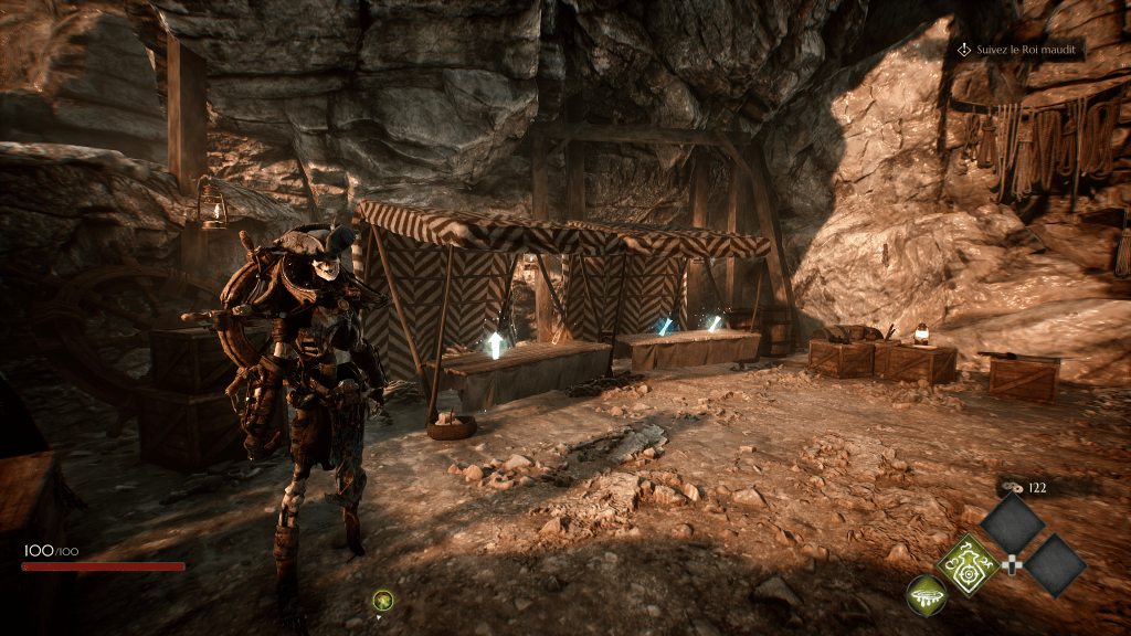Durant vos runs, il sera possible de s’améliorer dans une boutique tenue par un squelette. Contre de l’argent, il vous échangera divers objets. Au refuge, entre deux essais, vous pourrez également obtenir des améliorations diverses. Mais durablement cette fois. Que ce soit au puit ou au totem de puissance, vous glanerez divers bonus indispensables pour réussir votre quête. Dégâts supplémentaires, plus de santé de base, argent dans votre poche dès le début d’un essai, compétences électriques (ou de feu ou de poison etc.) améliorées, vous trouverez de quoi faire. Tout cela en échange de matériaux que vous récolterez dans les niveaux. Un établi est aussi de la partie, vous permettant de crafter de nouvelles armes, ainsi que des reliques ou encore des tomes élémentaires permettant de déverrouiller davantage de variétés d’atouts, là encore pour le poison, le feu ou encore l’électricité.