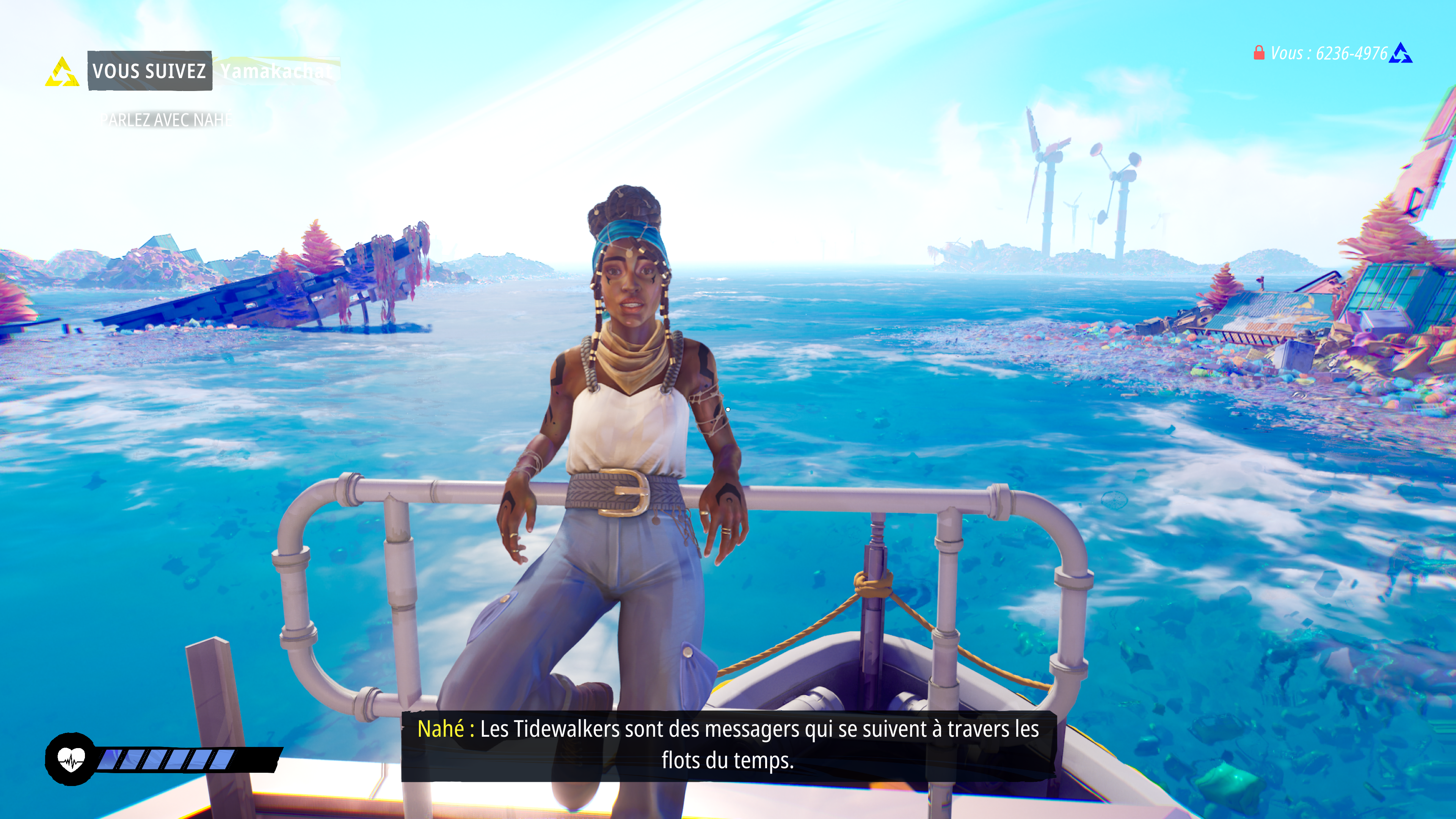 En plus de ses qualités narratives indéniables, Tides of Tomorrow est fort joli, avec une direction artistique colorée et sortant un peu de l’ordinaire. L’univers du jeu est de plus mystérieux, intriguant, avec une ambiance assez prenante. Tout comme dans Road 96, les différents personnages sont marquants, avec un caractère propre et hauts en couleur. Cela quel que soit la faction visitée. Vous rencontrerez les Maraudeurs, qui contrôlent la distribution de médicaments et le commerce, les Ferrailleurs, qui se débrouillent pour survivre au quotidien, et les Mystiques, un groupe mystérieux qui vénère le passé et dont certains membres semblent avoir des pouvoirs étranges. Sachez que vous n’aurez jamais à vous battre tout au long du jeu, sauf sur la mer avec votre bateau. Car le héros ne dispose pas d’une arme pour venir à bout des ennemis. Il faudra donc parfois être furtif, vous cachant par exemple dans des casiers ou sous des meubles, pour ne pas être repéré par les gardes. Ces phases sont bien souvent assez faciles, tout comme les passages où il faut s’enfuir, où il est quasi impossible de mourir tant il suffit de suivre un chemin très simple quasi en ligne droite. Le cœur du jeu est essentiellement porté sur la narration, les dialogues avec les PNJ, la découverte des zones et les choix à faire. On reprochera tout de même un côté un peu scripté au jeu, puisque l’exploration est finalement assez minime, avec des chemins déjà tout tracés d’avance la plupart du temps. Les zones sont assez petites, et sorti de quelques passages dérobés, on se contentera finalement d’aller d’un point A à un point B. C’est encore plus visible lors des phases en bateau sur l’océan, qu’on aurait aimé pouvoir explorer davantage.