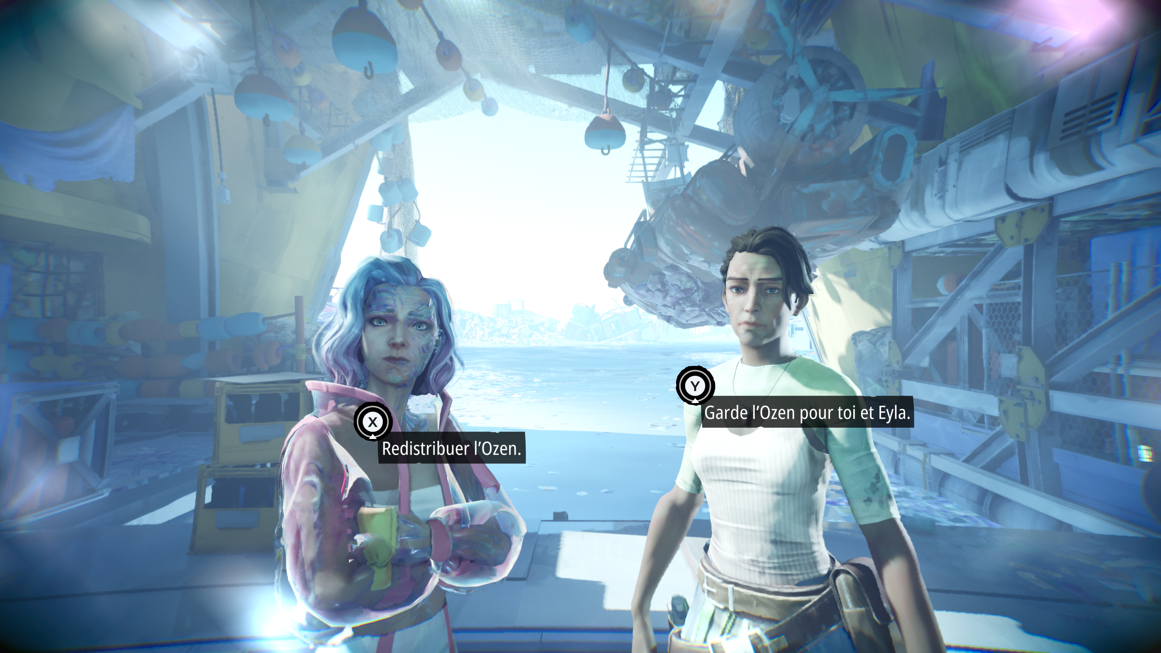 Une autre mécanique importante de Tides of Tomorrow, consiste à gérer votre stock d’Ozen, qui est tout simplement vital pour le personnage que l’on dirige. Car à chaque fois que vous changez de zones, vous perdez deux barres de votre jauge de santé. En sachant qu’utiliser une bouteille d’Ozen ne vous redonne qu’une barre de santé ! Il va donc falloir bien fouiller les zones, à la recherche du précieux médicaments mais aussi de ferrailles, qui est l’argent de ce monde. Avec, vous pourrez acheter des bouteilles d’Ozen à différents prix. Parfois, des décisions importantes seront vôtres, pouvant grandement jouer sur vos chances de survie ou sur celles d’autres PNJ, et surtout du monde ! Déciderez-vous de voler des caisses d’Ozen pour vous et une amie ? Ou prendrez-vous le risque de sacrifier une vie pour le bien de tous ? Déciderez-vous de mentir pour maximiser vos chances de survie, en sachant que ce mensonge peut nuire au prochain joueur ? Les décisions sont parfois lourdes de sens. On remarque cependant que, selon la personne que l’on suit, il est parfois difficile d’obtenir un autre résultat, continuant ainsi une boucle où certaines voies sont plus difficiles que d’autres. Cela est assez visible dans les dialogues, où la réussite se joue parfois à la phrase près. Cependant, cela donne une très bonne durée de vie au jeu, qui variera beaucoup d’un joueur à l’autre. Certains niveaux étant facultatifs, comme ces combats et événements en bateau (votre principal moyen de locomotion) sur l’océan. Comptez entre 10 et 15 heures pour une partie, et bien plus si vous souhaitez explorer l’ensemble des voies possibles.