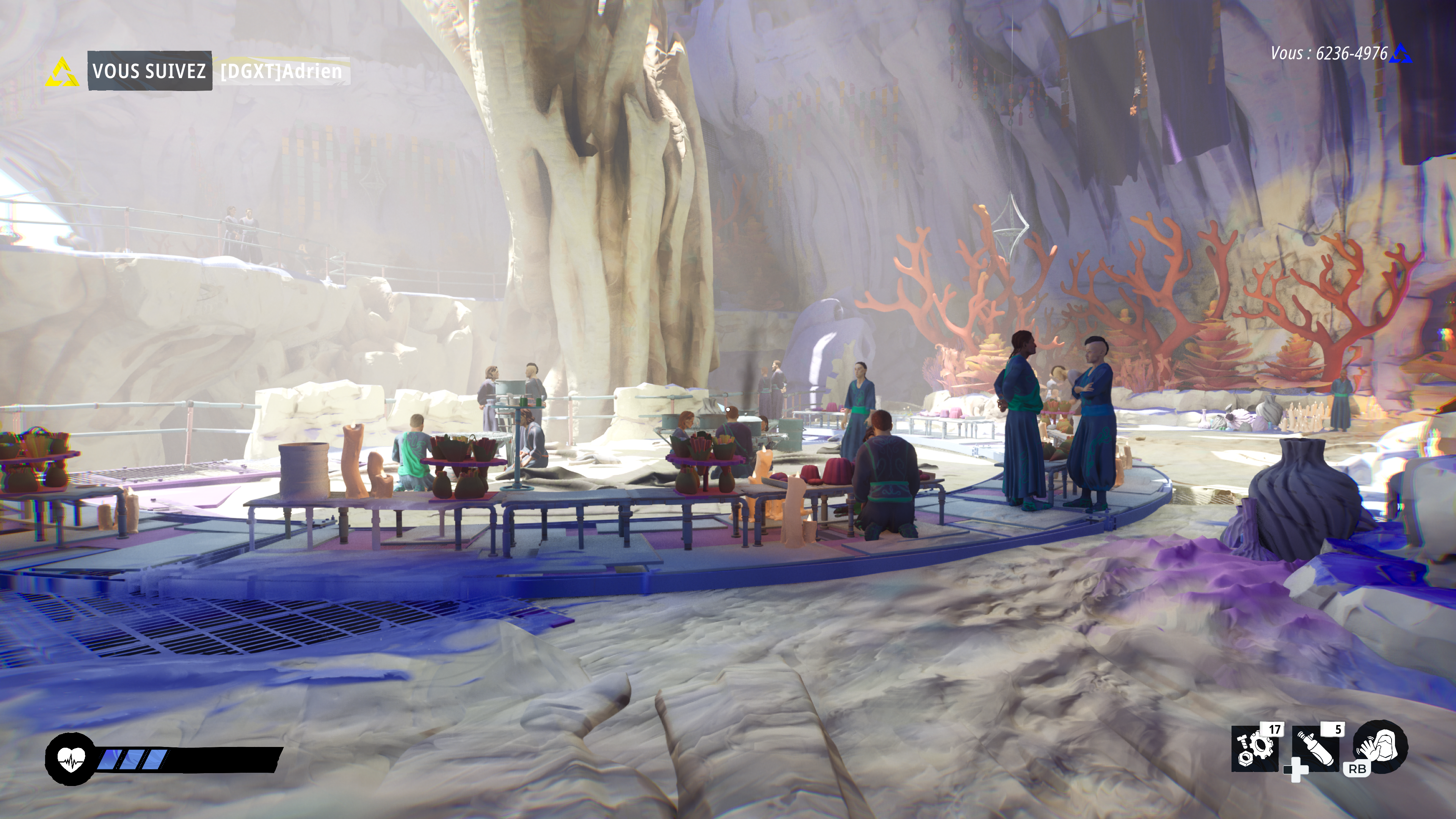 Jouable uniquement en solo, Tides of Tomorrow est cependant fort d’une mécanique multijoueur particulièrement originale. Au début du jeu, vous choisissez dans une liste un profil de joueurs ayant précédemment parcouru l’aventure. On s’aperçoit que ce joueur a différentes « statistiques » dans le sens où il est survivaliste, pro humanité, pro nature, fauteur de troubles, ou encore agent du chaos. Si vous décidez de suivre le chemin de ce joueur, alors vous ferez face aux conséquences de ses actes. Pour vous donner un exemple, cela signifie que vous pouvez être le bienvenu dans un lieu, ou au contraire y être interdit de séjour ! Les gardes et habitants se rappelant en quelque sorte les agissements du précédent joueur. Ainsi, nos propres actions influenceront elles aussi directement les prochains joueurs et le déroulement de leurs aventures ! De plus, vous avez la possibilité d’aider les futurs joueurs, par exemple en leur laissant de l’Ozen dans une caisse, ou tout simplement en donnant de l’argent à des marchands qui pourront alors renouveler les stocks pour la prochaine personne qui suivra vos traces. Une mécanique particulièrement originale, et véritablement très prenante, qui peut énormément modifier votre expérience de jeu. Car selon la personne que vous suivez, vous ne passez pas du tout par les mêmes endroits, et n’abordez pas une situation de la même manière. Parfois, vous ferez face à différents embranchements, et pourrez décider de suivre un autre joueur. Enfin, en appuyant sur la touche LT vous pourrez avoir des visions du passé, et observer les agissements des précédents Tidewalkers. Et parfois, ces indications seront utiles, indiquant par exemple la présence de passages secrets ! Libre à vous également d’utiliser différentes émotes, pour exprimer vos talents de danseurs ou ne serait-ce que pour saluer vos successeurs !