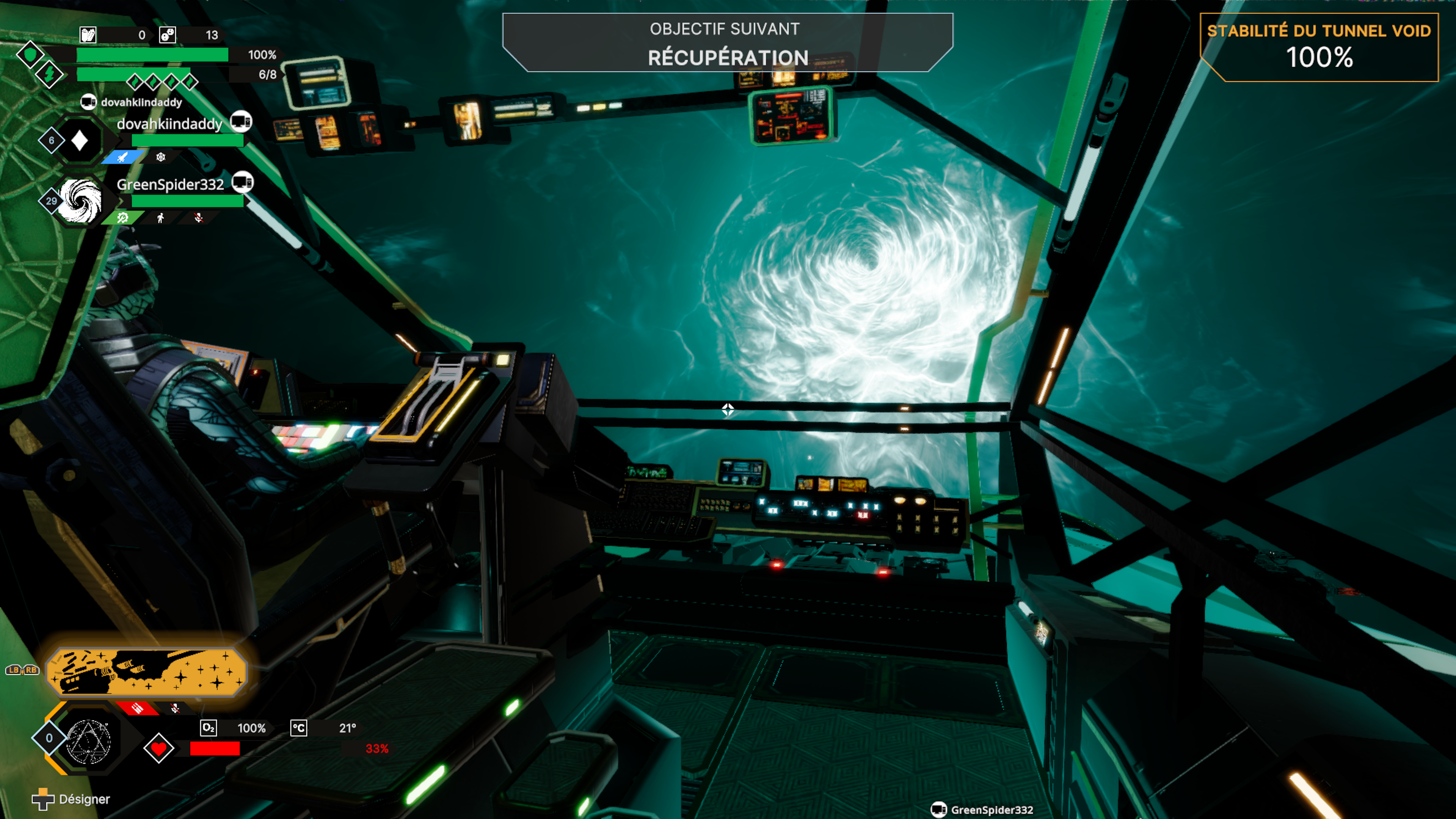 Car il faudra être particulièrement polyvalent dans Void Crew, sous peine de vite finir en Game Over. Piloter, faire feu sur les différentes menaces, sortir dans l’espace pour réparer des avaries ou encore analyser ou construire des objets à l’intérieur de votre engin, il y a de quoi faire. Sans compter que l’espace est plein de menace, entre ces extraterrestres qui vous attaquent, les mines spatiales, et même l’espace lui-même qui veut votre mort ! Comme avec le biome de feu qui surchauffe votre vaisseau par exemple. Il vous faudra souvent réagir vite, notamment lorsqu’il s’agira d’équilibrer des systèmes du vaisseau à des moments cruciaux. Un principe qui rappelle donc FTL: Faster Than Light, sorti en 2012 pour ceux qui ont pu s’y essayer. Sauf qu’ici, nous sommes en vue FPS. Grâce à cette vue on repère donc assez aisément les repères d’objectifs ou encore les grosses manettes, leviers et boutons à activer. On constate également que les graphismes ne sont pas très jolis mais ils ne sont pas moches non plus. Et il faut dire que la jolie direction artistique futuriste fait largement le job. Attendez un peu d’être dans le hub multijoueurs pour voir ! À noter d’ailleurs pour info que le crossplay est de la partie.